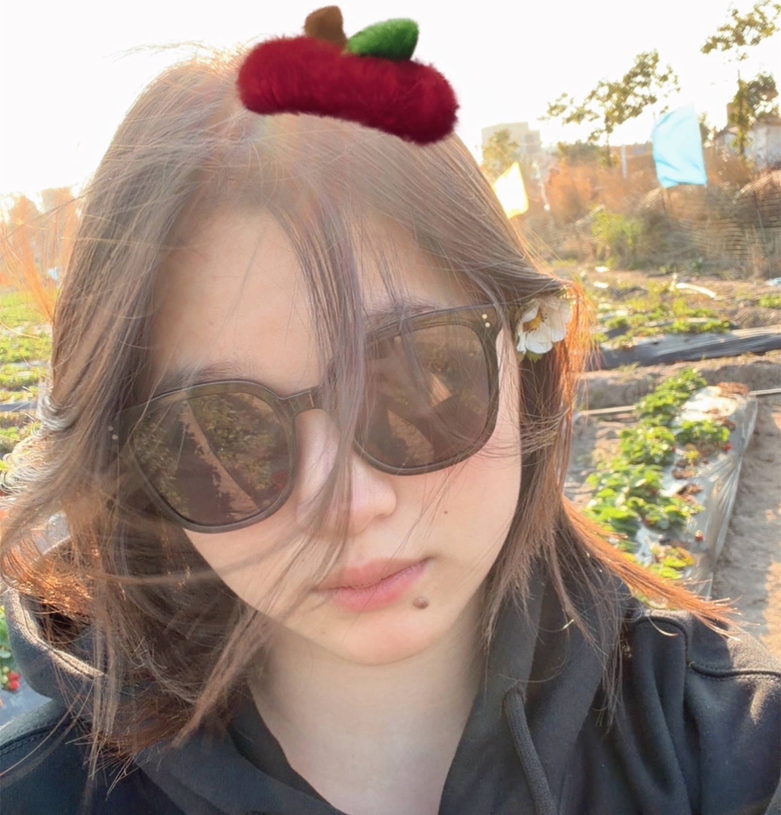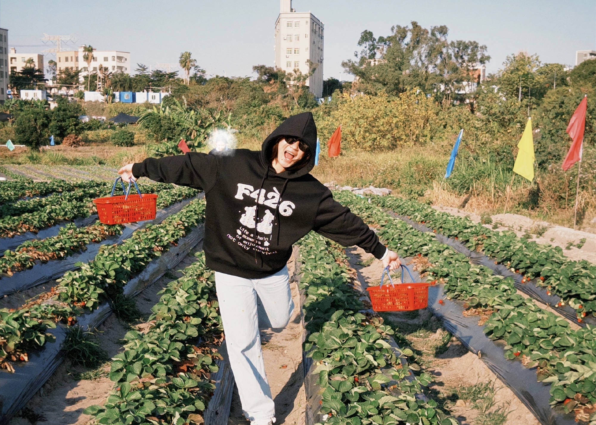 全红婵穿了一件黑色的运动帽衫,戴了一副墨镜,手里拎了两个小篮子。在草莓地里,全红婵张嘴直乐摆造型拍照。