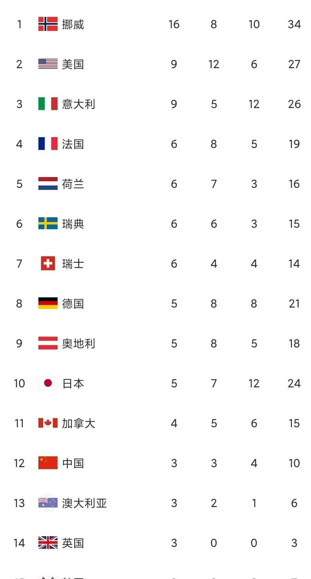 随着这两个项目结束,最新的金牌榜刷新了。 挪威队依然一骑绝尘,16枚金牌让他们稳坐头把交椅。 美国队金牌数来到9枚,追平了东道主意大利。 但比较银牌数时,美国队有12枚,意大利只有5枚,因此美国队成功反超,升至第二位。 意大利队虽然主场作战,但后劲似乎有些不足,被挤到了第三。
